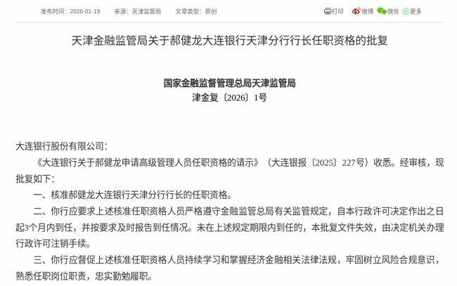 2026年1月19日,根据国家金融监督管理总局消息,《大连银行关于郝健龙申请高级管理人员任职资格的请示》获得通过,批复郝健龙大连银行股份有限公司天津分行行长的任...