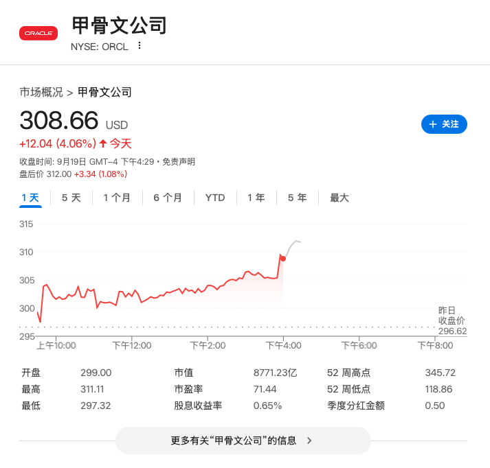 周五,甲骨文股价收盘上涨4.06%,至308.66美元。在云业务的强劲推动下,该公司股价今年已累计上涨85%。