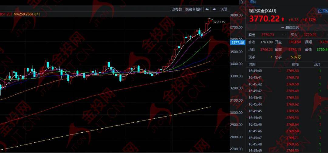 隔夜,现货黄金延续创纪录走势,触及3791美元的全新历史高点,最终收报于3763.86美元。今日欧市盘中,黄金小幅上涨,目前在3770美元附近徘徊。