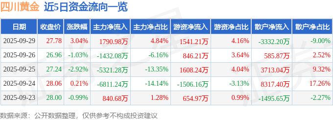 证券之星消息,截至2025年9月29日收盘,四川黄金(001337)报收于27.78元,上涨3.04%,换手率4.68%,成交量13.49万手,成交额3.7亿元。