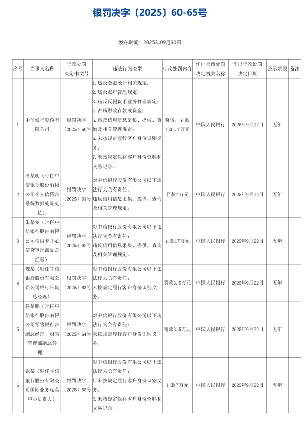 9月30日,中国人民银行网站发布《银罚决字〔2025〕60-65号》,作出行政处罚决定日期为2025年9月22日。