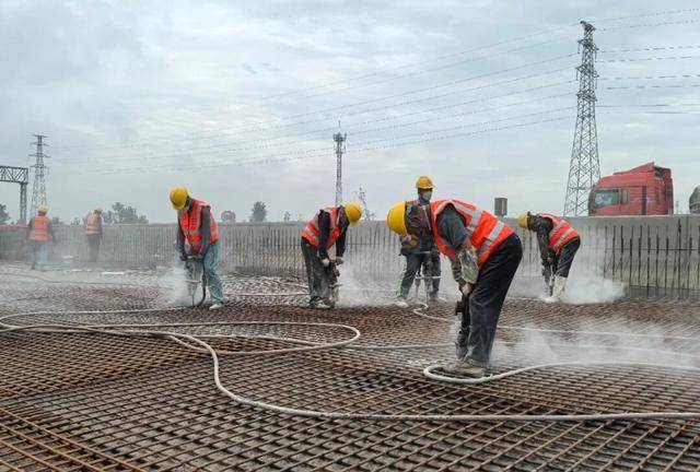 在沈海高速改扩建日照段二标段巨峰河大桥施工现场,30余名施工人员分工协作,有序开展老桥面凿毛与护栏混凝土浇筑两大工序。手持风镐的工人们正进行老桥凿毛作业,沉闷的“突突”声不绝于耳,飞溅的碎石在阳光下闪烁,为后续的桥梁加固打下坚实基础。同时,桥侧护栏施工同步展开,两辆混凝土罐车早已就位,粗壮的输送泵管如银蛇般延伸至模板旁,随着罐车罐体缓缓转动,灰白色的混凝土被源源不断地注入钢模,工人们则紧随其后用振捣棒细致地来回穿梭,确保每一寸混凝土都密实饱满,共同构筑起大桥安全的坚固屏障。工人师傅们额头的汗水顺着脸颊滑落,却丝毫未放慢手中的节奏,他们以实干为“双节”献礼,让奋斗成为这个节日里最动人的底色。