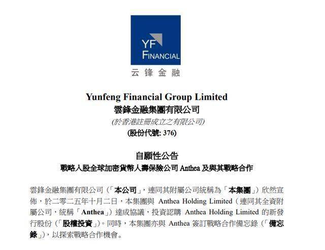 云锋金融发布公告,战略入股全球加密货币人寿保险创新平台Anthea Holding Limited,双方签订战略合作备忘录,以探索战略合作机会。