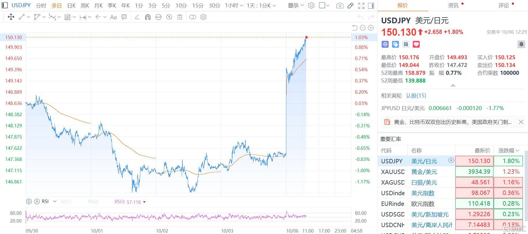 日元大幅承压。截止发稿,美元/日元突破150关口。