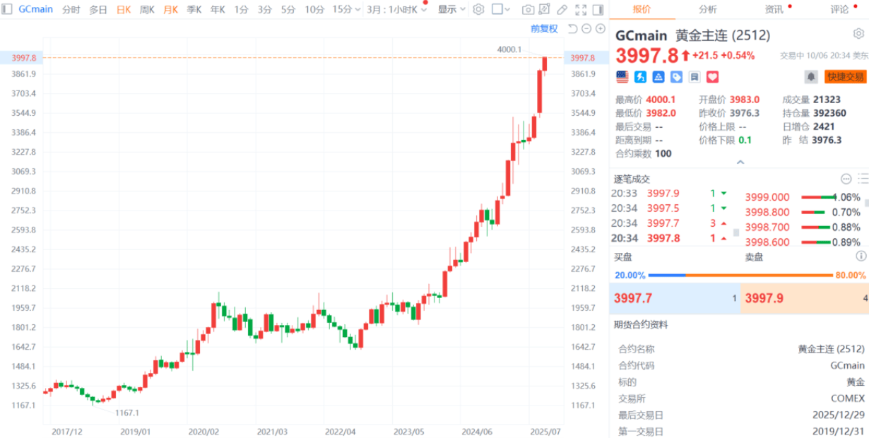 【大河财立方消息】10月7日,纽约期金历史首次触及4000美元/盎司整数大关,日内涨幅0.55%,年内大涨逾50%。现货黄金报3976.94美元/盎司,同样创下历史新高。