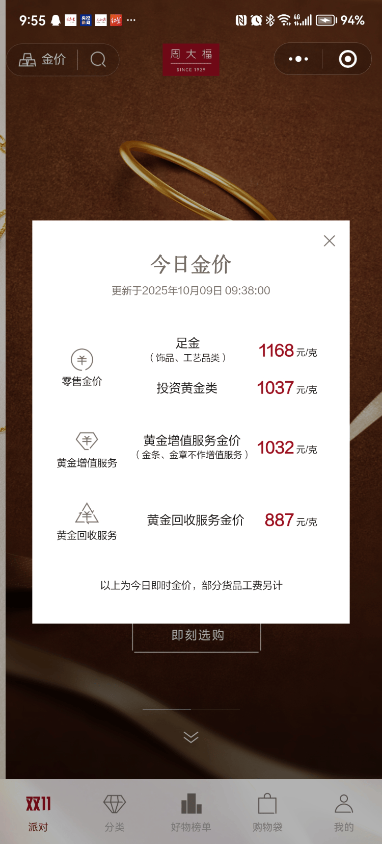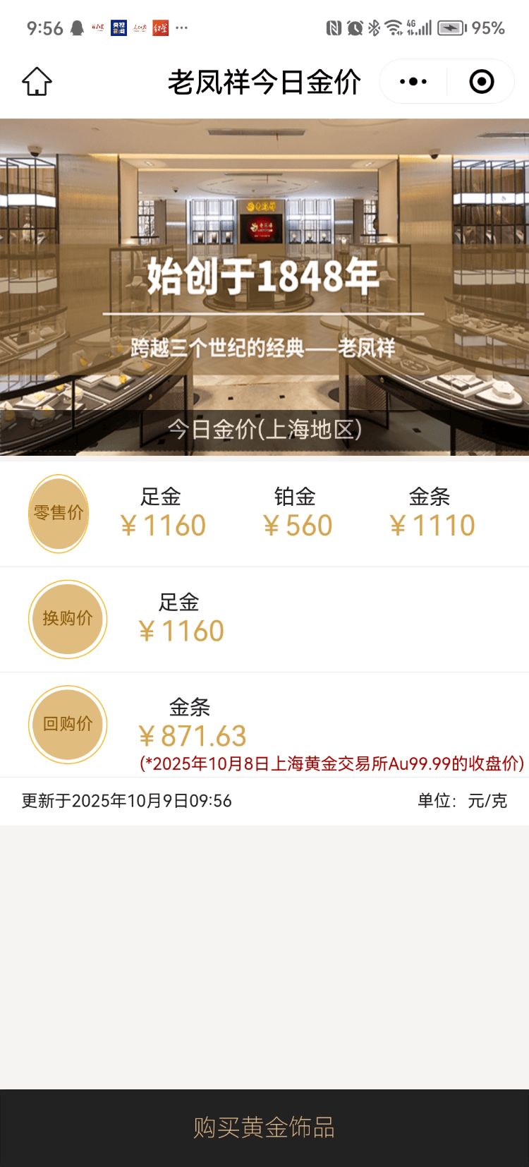 10月9日,上游新闻记者查询发现,老凤祥足金饰品克价为1160元,较10月1日(1125元)上涨35元;周生生足金饰品克价为1170元,较10月1日(1130元)上涨40元;周大福足金(饰品、工艺品类)克价为1168元,较10月1日(1129元)上涨39元。