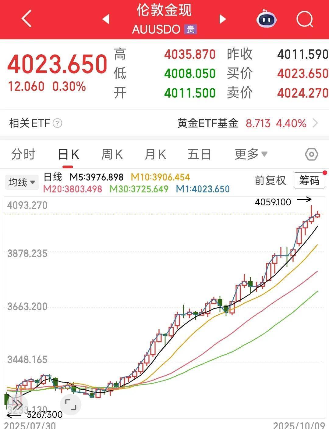 国庆假期期间,黄金连续大涨。现货黄金最高触及4059.31美元/盎司。COMEX黄金期货主力最高报4081.00美元/盎司。