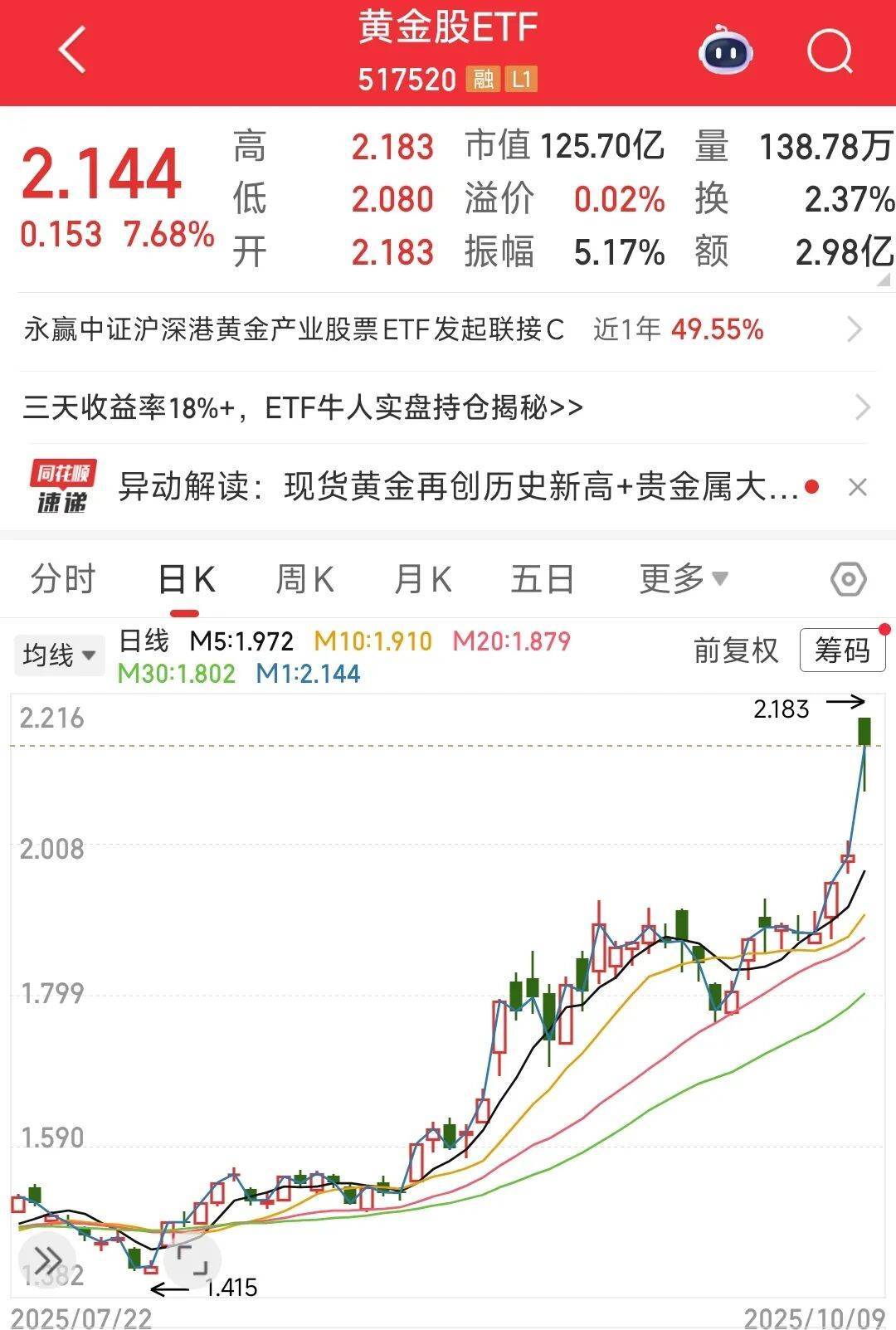 黄金股开盘大涨,黄金股etf(517520)大涨超过7%,晓程科技涨超10%,四川黄金、白银有色、江西铜业10%涨停,山东黄金、中金黄金、赤峰黄金、中国黄金国际、山金国际等多股涨超7%。