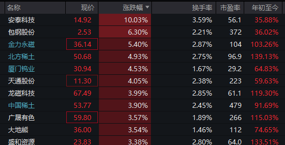稀土永磁概念中,安泰科技10.03%涨停,包钢股份、金力永磁、厦门钨业、北方稀土、广晟有色、龙磁科技、中国稀土、盛和资源等涨幅较大。消息面上,10月9日,商务部公布对境外相关稀土物项实施出口管制的决定和对稀土相关技术实施出口管制的决定。