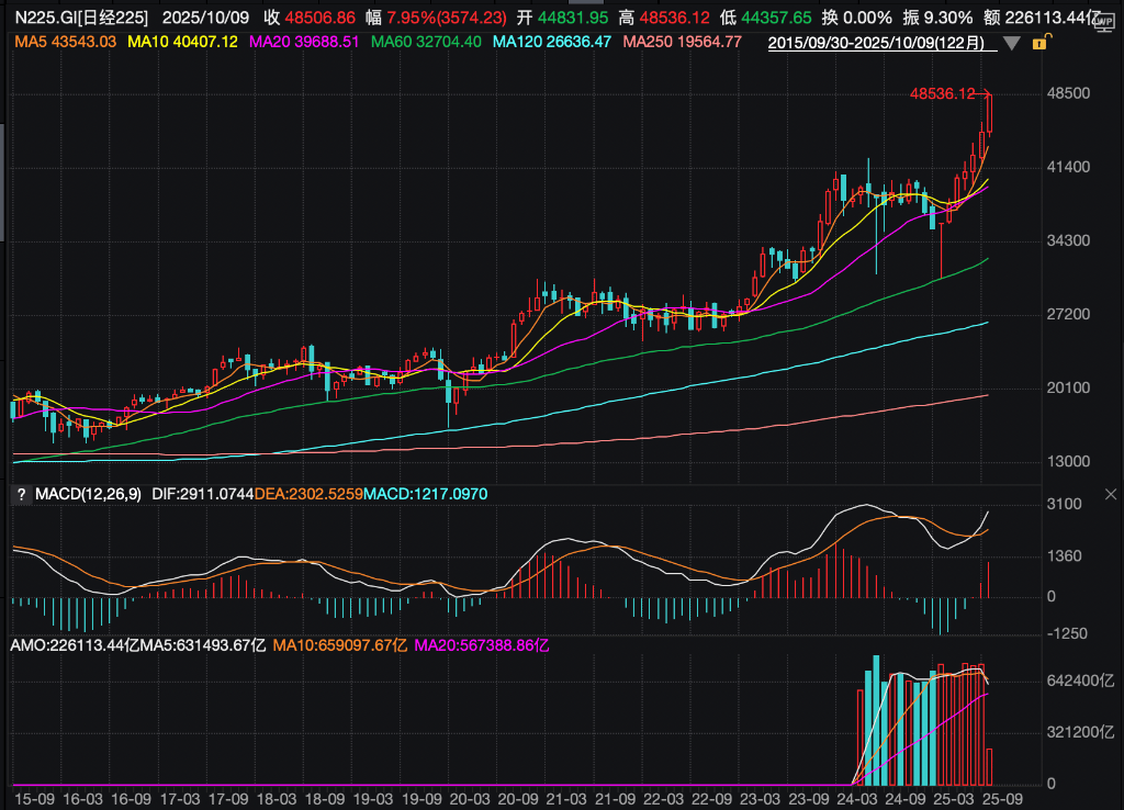 - 日经225指数一度突破48536点,创历史新高。