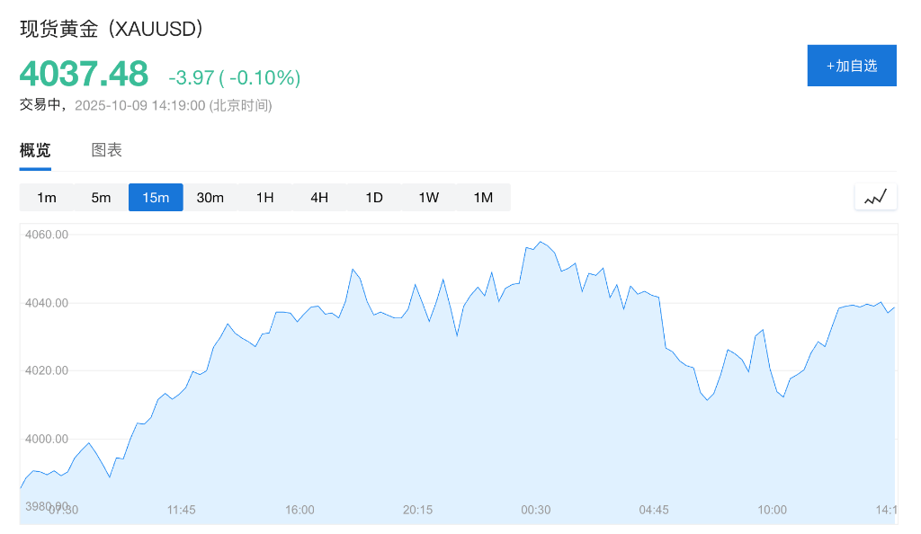 - 现货黄金下跌0.1%至每盎司4037.48美元。