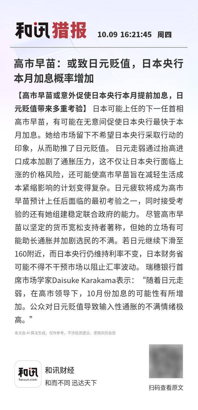 【高市早苗或意外促使日本央行本月提前加息,日元贬值带来多重考验】日本可能上任的下一任首相高市早苗,有可能在无意间促使日本央行最快于本月加息。她给市场留下不希望日本央行采取行动的印象,从而助推了日元贬值。 日元走弱通过抬高进口成本加剧了通胀压力,这不仅让日本央行面临上涨的价格风险,还可能使高市早苗旨在减轻生活成本紧缩影响的计划变得复杂。日元疲软将成为高市早苗预计上任后面临的最初考验之一,同时接受考验的还有她组建稳定联合政府的能力。 尽管高市早苗以坚定的货币宽松支持者著称,但她的立场有可能助长通胀并加剧选民的不满。若日元继续下滑至160附近,而日本央行仍维持利率不变,日本财务省可能不得不干预市场以阻止汇率波动。 瑞穗银行首席市场学家Daisuke Karakama表示:“随着日元走弱,在高市领导下,10月份加息的可能性有所增加。公众对日元贬值导致输入性通胀的不满情绪极高。”
