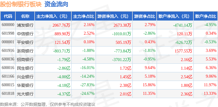 从资金流向上来看,当日股份制银行板块主力资金净流出16.96亿元,游资资金净流入7.34亿元,散户资金净流入9.63亿元。股份制银行板块个股资金流向见下表: