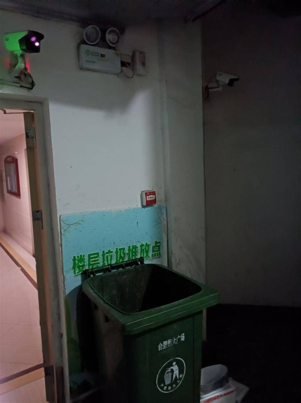 9日上午,极目新闻记者来到该小区看到,19栋负一楼电梯口左右两侧过道走到头,在停放电瓶车的地方有两处共三个垃圾桶,两处放垃圾桶的地方一处没有监控摄像头,另外一处虽然有监控摄像头,但垃圾桶放置在摄像头正下方,处于监控盲区。