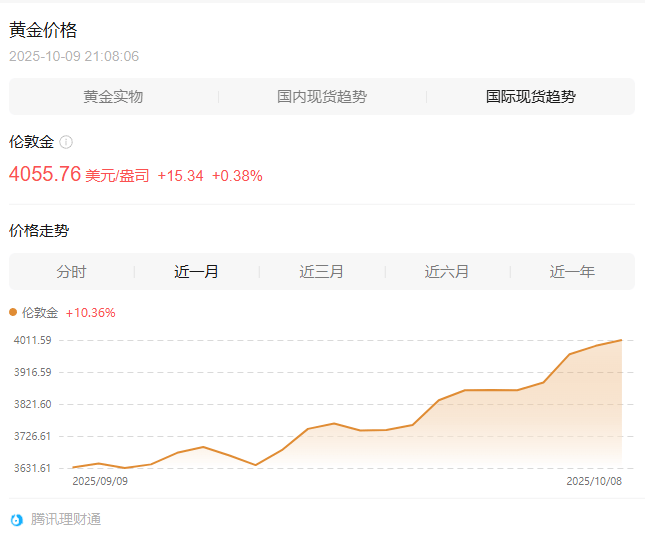现货黄金伦敦金也持续上涨,目前报4055.76美元/盎司。