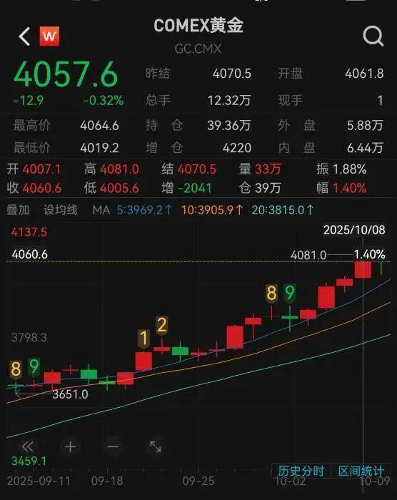 截至10月8日,COMEX黄金最高触及4081美元/盎司,创下历史新高。
