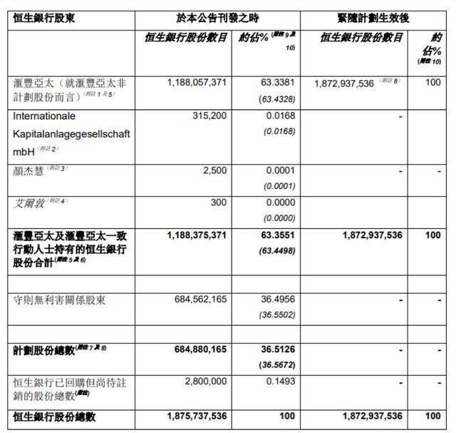 股权架构上,恒生银行已发行股份18.757亿股,汇丰亚太及其一致行动人持股63.36%,计划股份总数为6.8488亿股。