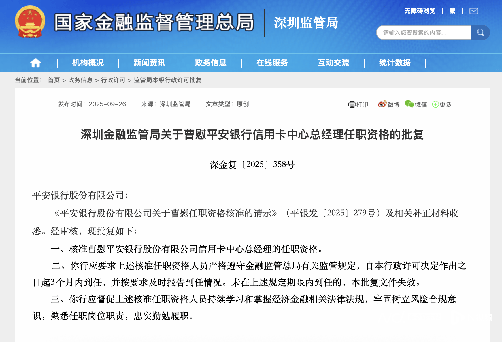 9月26日,深圳金融监督管理局发布的批复显示,核准曹慰平安银行股份有限公司信用卡中心总经理的任职资格。