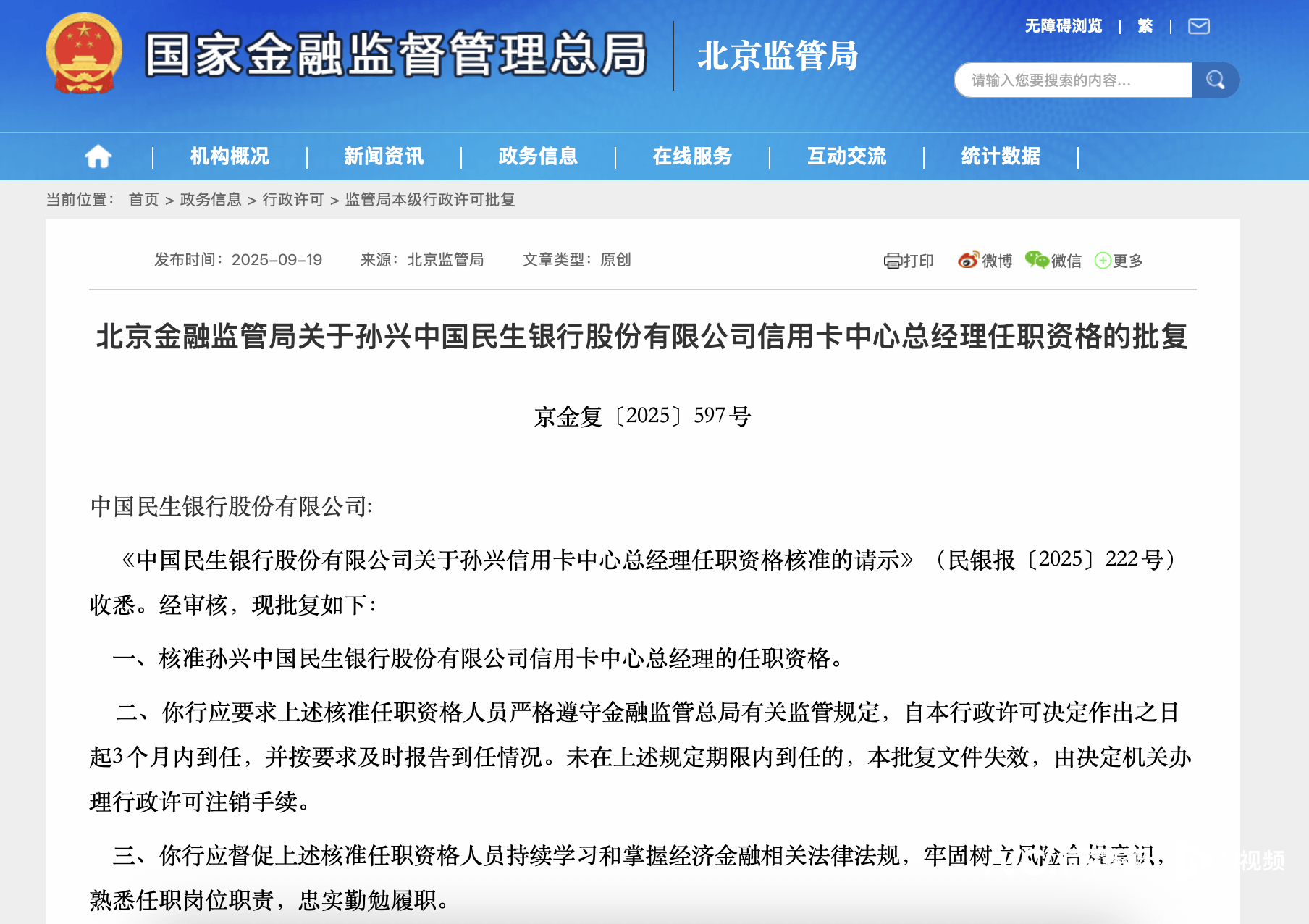 9月19日,北京金融监督管理局发布的批复显示,核准孙兴中国民生银行股份有限公司信用卡中心总经理的任职资格。