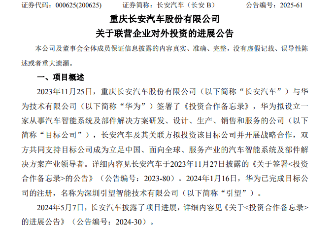 公告介绍,2023年11月底,长安汽车与华为签署《投资合作备忘录》,华为拟设立一家从事汽车智能系统及部件解决方案研发、设计、生产、销售和服务的公司,长安汽车及其关联方拟投资该目标公司并开展战略合作。由此,引望汽车初具雏形,后续投资动作也就此逐步展开。