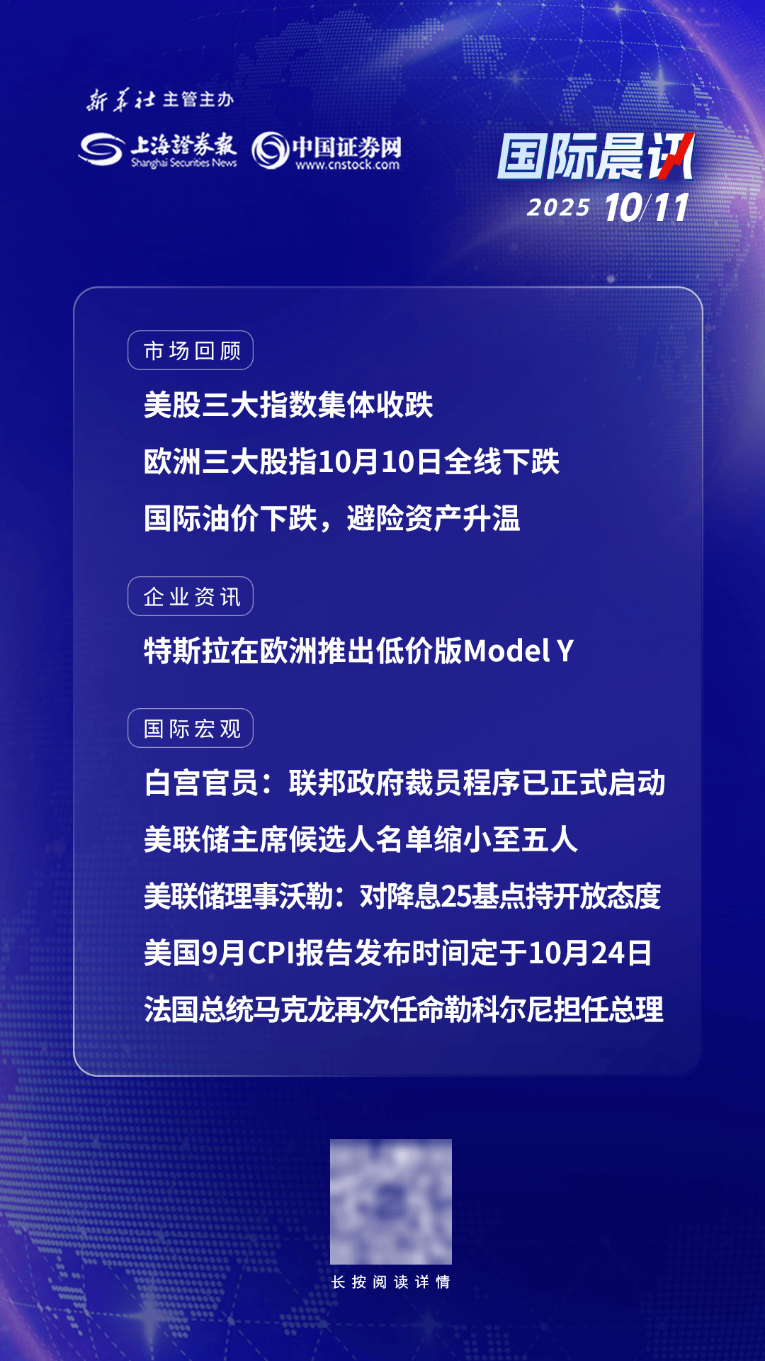 美股三大指数集体收跌;欧洲三大股指10月10日全线下跌;白宫官员:联邦政府裁员程序已正式启动;美联储主席候选人名单缩小至五人;美联储理事沃勒:对降息25基点持开放态度;美国9月CPI报告发布时间定于10月24日。