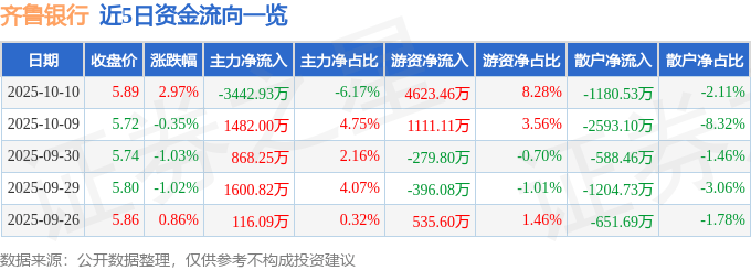证券之星消息,截至2025年10月10日收盘,齐鲁银行(601665)报收于5.89元,上涨2.97%,换手率1.55%,成交量95.09万手,成交额5.58亿元。