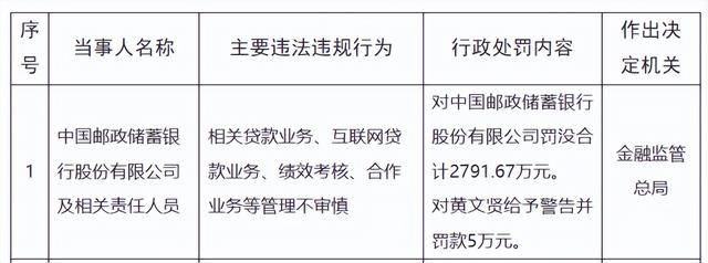 9月30日,国家金融监督管理总局官网公示的行政处罚决定书显示,中国邮政储蓄银行股份有限公司因相关贷款业务、互联网贷款业务、绩效考核、合作业务等管理不审慎被罚没合计2791.67万元,黄文贤被警告并罚款5万元。