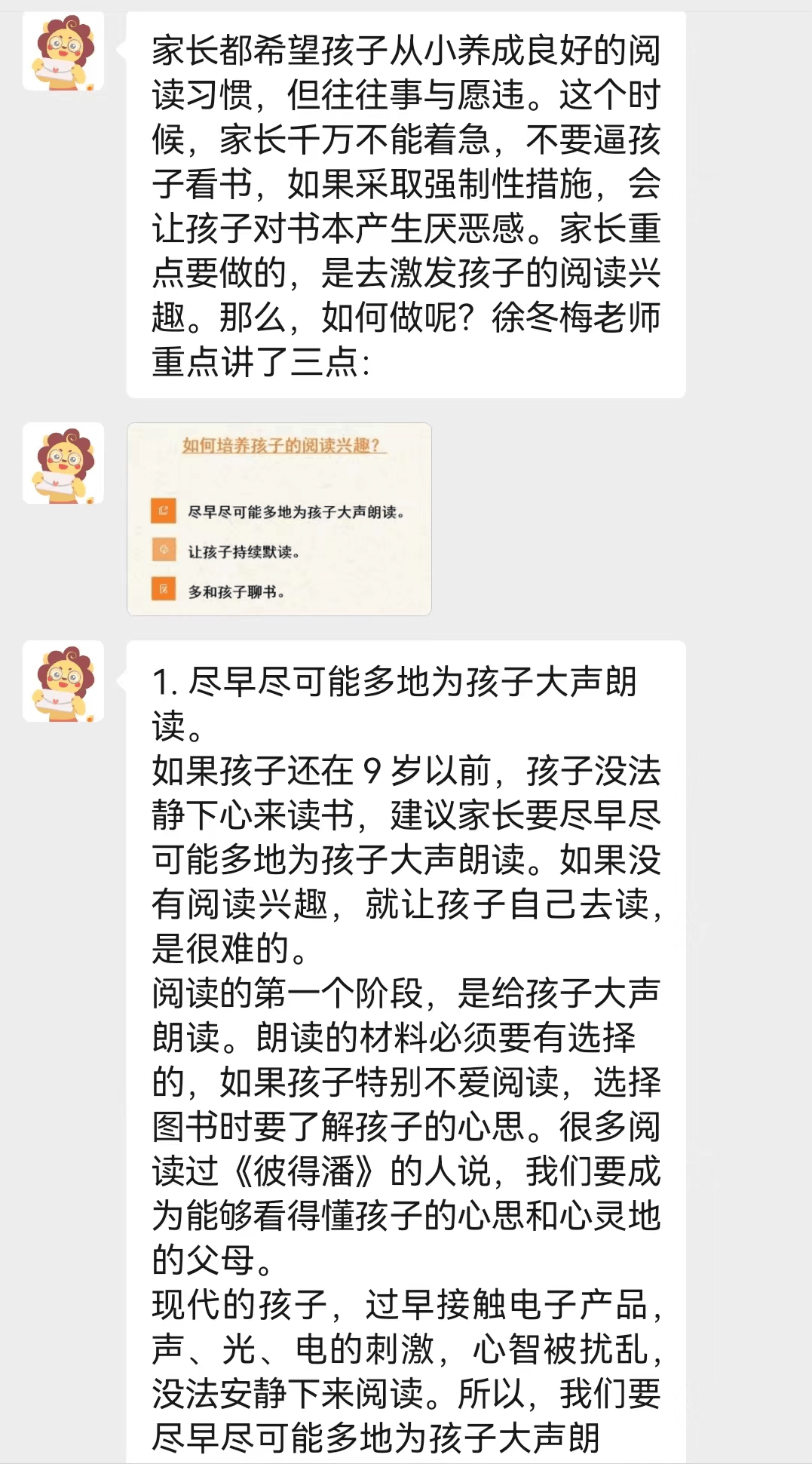 家长们有任何孩子的阅读问题,都可以1对1咨询伴读老师;伴读老师还会在社群分享干货,帮助家长更好地理解,协助孩子阅读、成长!