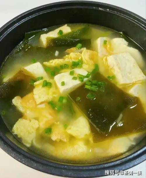 材料:海带 100 克、豆腐 1 块、姜片、盐、食用油、葱花适量。