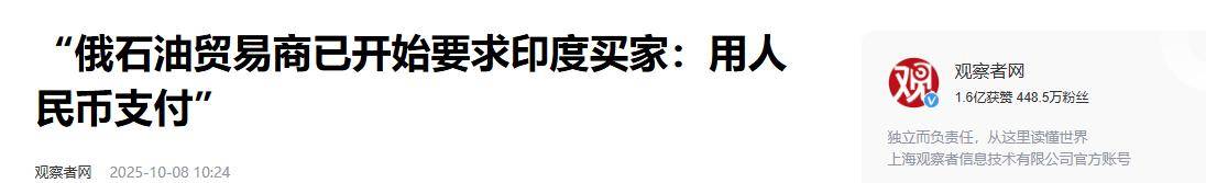 1. 《“俄石油贸易商已开始要求印度买家:用人民币支付”》2025-10-08 10:24 | 来源:观察者网