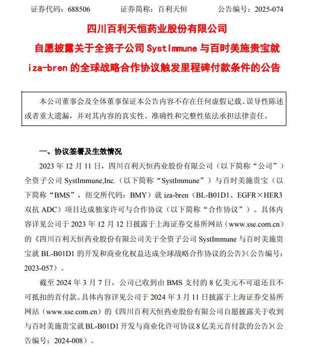 10月12日,百利天恒(688506.SH)公告称,全资子公司SystImmune与百时美施贵宝就BL-B01D1(EGFR×HER3双抗ADC)项目达成的合作协议已触发里程碑事件,正式触发合作协议项下第一笔2.5亿美元的近期或有付款条件。SystImmune将于近期收到款项,实际到账金额需扣除银行手续费。根据合作协议,公司后续还有资格获得最高可达2.5亿美元的近期或有付款,以及在达到特定的开发、注册和销售里程碑后最高可达71亿美元的额外付款。