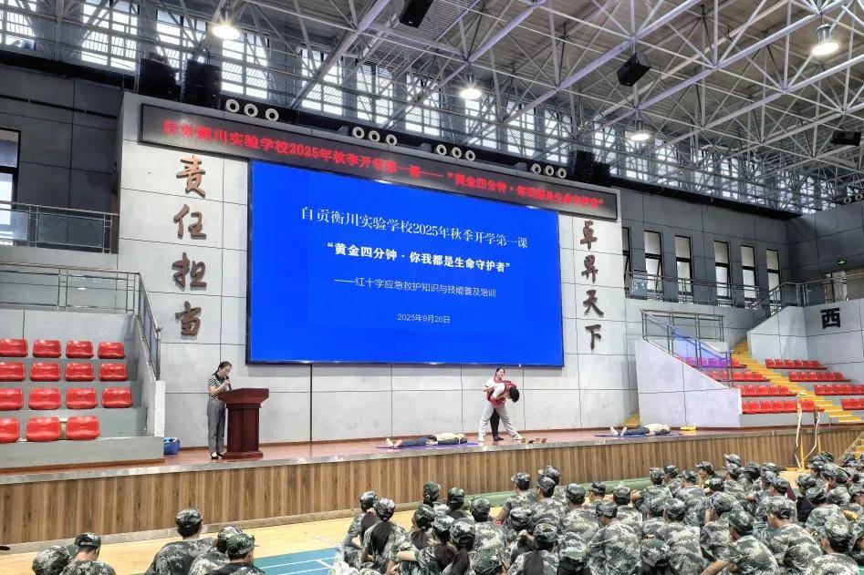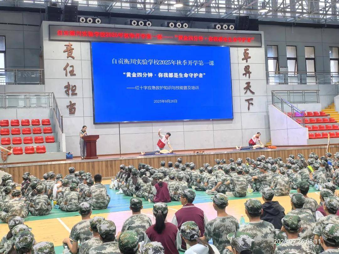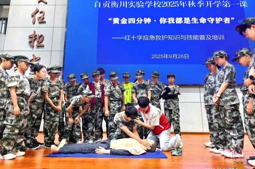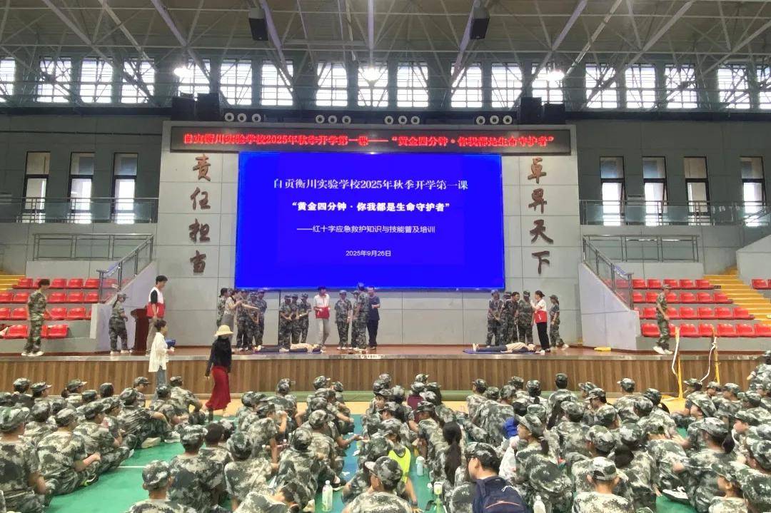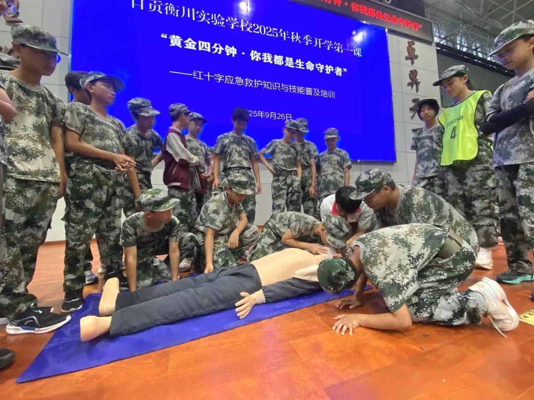 为提高学生在突发事件中的自救互救能力,9月26日上午,自贡衡川实验学校邀请富顺县红十字会到校开展“黄金四分钟,你我都是生命守护者”应急救护普及进新生军训营活动。