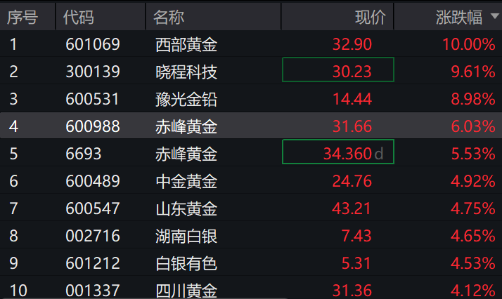 截至2025年10月13日 13:44,中证沪深港黄金产业股票指数(931238)强势上涨2.27%,成分股西部黄金(601069)上涨10.00%,晓程科技(300139)上涨9.61%,豫光金铅(600531)上涨8.98%,赤峰黄金(600988),赤峰黄金(06693)等个股跟涨。