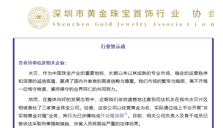 10月11日,深圳市黄金珠宝首饰行业协会发布官方警示函,披露深圳水贝片区三家黄金珠宝公司因涉嫌开设赌场罪被司法机关查处。这是继9月中旬水贝10余家黄金料商经营异常、人去楼空引发行业“大地震”后,该片区一个月内出现的第二起重大行业风波,再度将黄金市场的违规交易乱象推向公众视野。