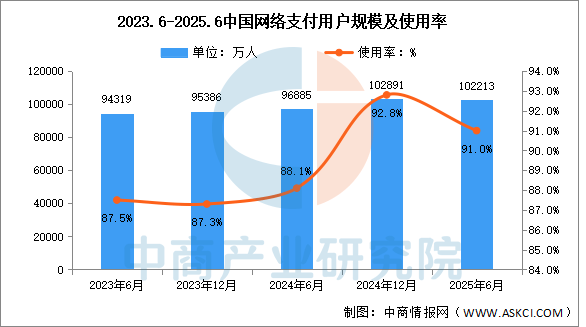 中商情报网讯:截至2025年6月,我国网络支付用户规模达10.22亿人,占网民整体的91.0%。