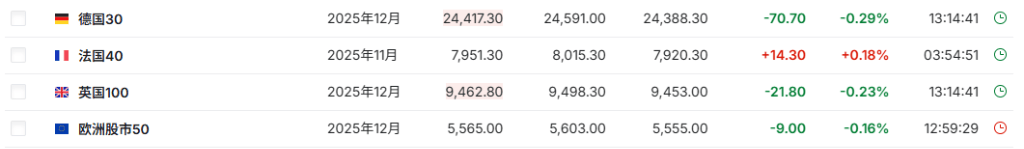 德国、英国等主要股指小幅下跌,欧洲股指50指数跌0.16%。