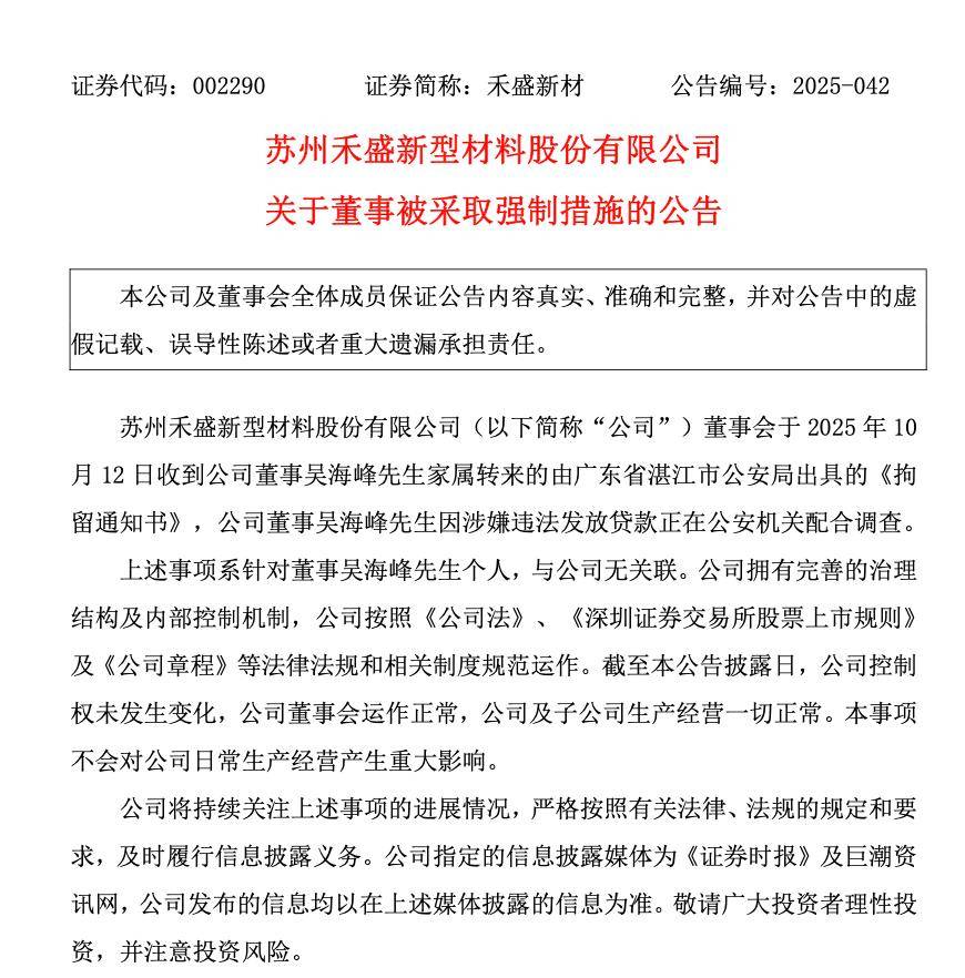 10月13日晚间,深交所上市公司禾盛新材(002290.SZ)发布公告称,董事会于10月12日收到董事吴海峰家属转来的由广东省湛江市公安局出具的《拘留通知书》,董事吴海峰因涉嫌违法发放贷款正在公安机关配合调查。