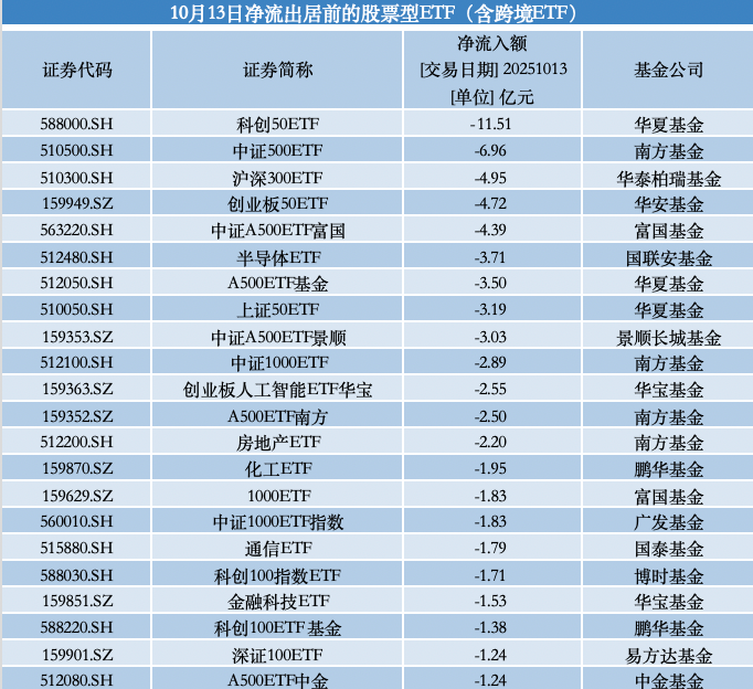 具体来看,华夏科创50ETF的净流出额达11.51亿元、南方中证500ETF、华安创业板50ETF、华夏上证50ETF的净流出额均在3亿元以上。