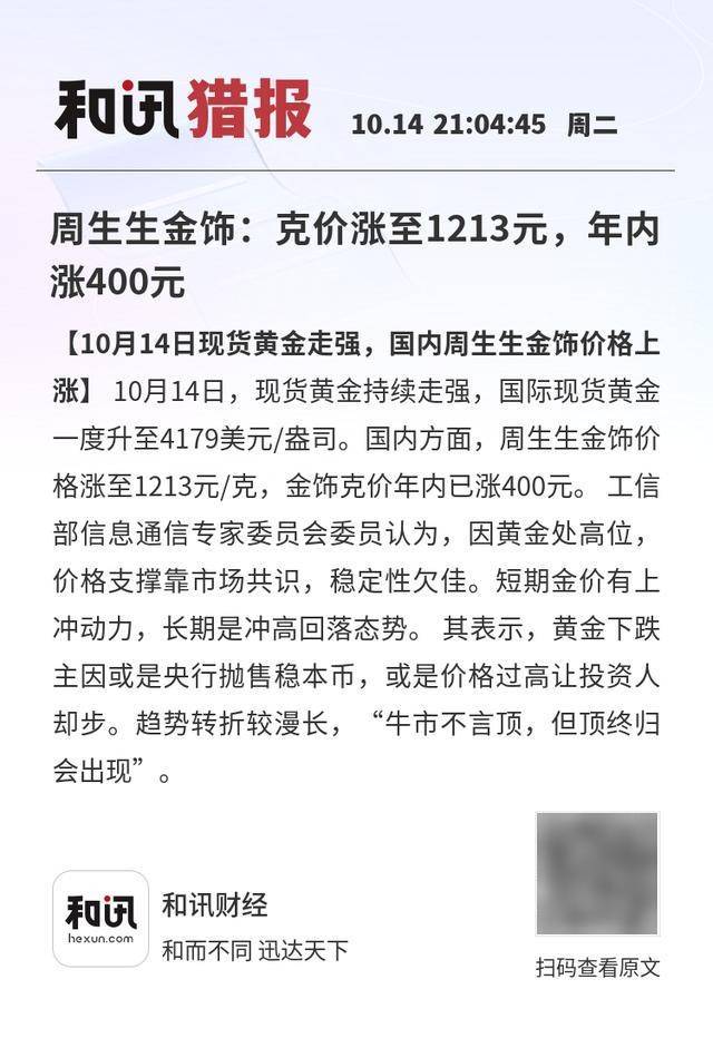 【10月14日现货黄金走强,国内周生生金饰价格上涨】10月14日,现货黄金持续走强,国际现货黄金一度升至4179美元/盎司。国内方面,周生生金饰价格涨至1213元/克,金饰克价年内已涨400元。 工信部信息通信专家委员会委员认为,因黄金处高位,价格支撑靠市场共识,稳定性欠佳。短期金价有上冲动力,长期是冲高回落态势。 其表示,黄金下跌主因或是央行抛售稳本币,或是价格过高让投资人却步。趋势转折较漫长,“牛市不言顶,但顶终归会出现”。