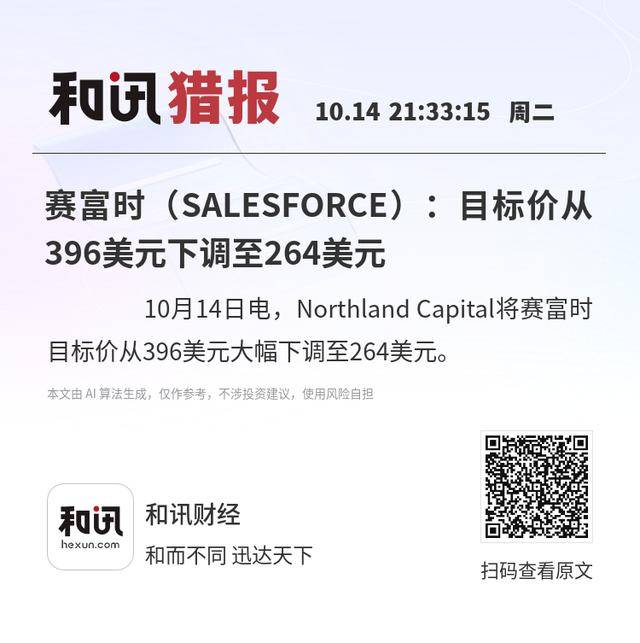 10月14日电,Northland Capital将赛富时目标价从396美元大幅下调至264美元。