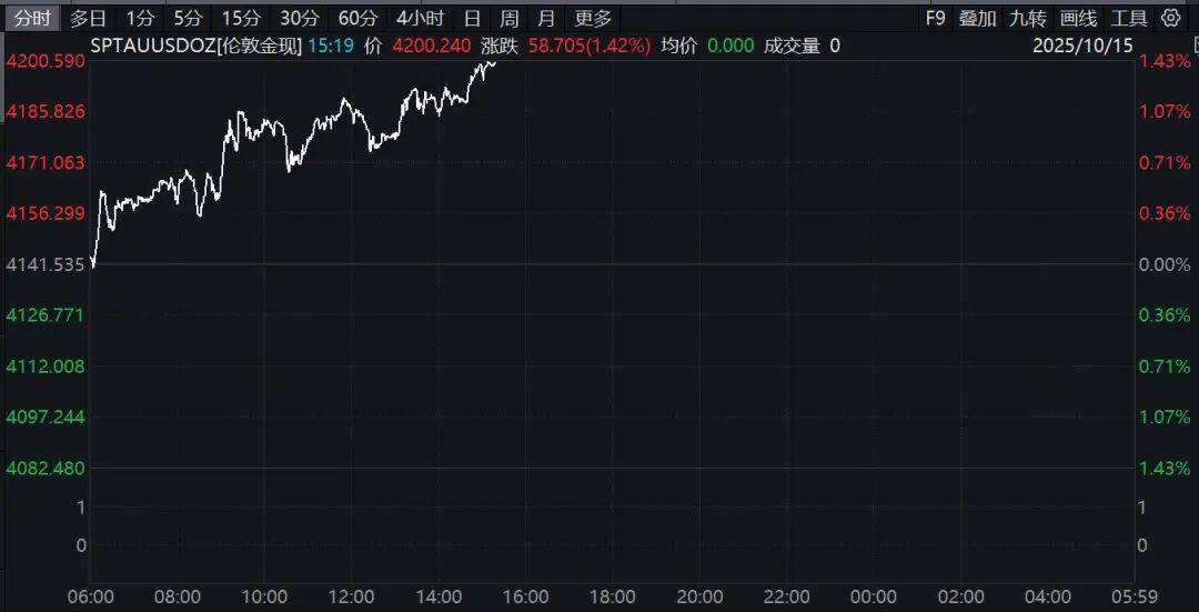 10月15日下午,现货黄金拉升涨逾1.4%,首次突破4200美元/盎司关口。