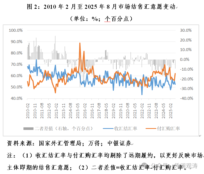 2025年3~8月人民币止跌回升,市场情形与2018年初至2020年5月较为相似。6个月间,收汇结汇率环比上升与下降的各占一半,反倒是付汇购汇率环比下降的占到2/3,与预期的变动方向相悖。同期,收汇结汇率平均为53.7%,较2023年7月至2025年2月均值小幅回升0.5个百分点;付汇购汇率平均为58.0%,大幅回落5.2个百分点;收汇结汇率较付汇购汇率平均低了4.3个百分点,差值收敛了5.7个百分点(见图2)。