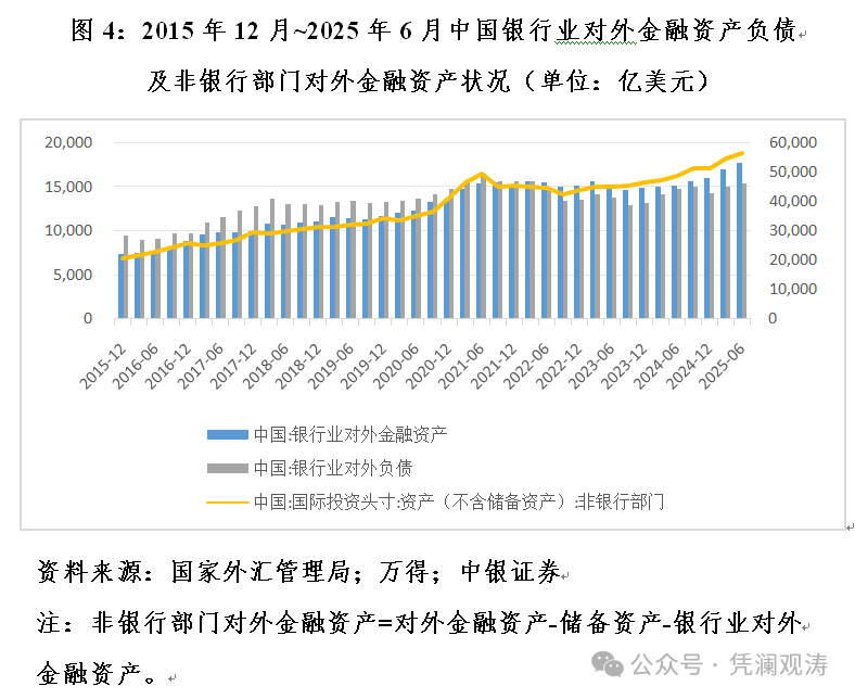 如2020年三季度至2022年一季度,人民币总体面临升值压力,境内外汇供大于求(银行累计结售汇顺差4485亿美元),我国民间对外金融资产新增1.31万亿美元。其中,非银行部门新增9838亿美元,占比75.0%;银行部门新增3280亿美元,占比25.0%。2022年二季度至2025年一季度,人民币总体承压,境内外汇供不应求(银行累计结售汇逆差2773亿美元),民间对外金融资产新增上万亿美元。其中,非银行部门新增9519亿美元,占比88.0%;银行部门新增1293亿美元,仅占12.0%,较2020年三季度至2022年一季度占比回落了13个百分点。2025年二季度,人民币止跌反弹,境内外汇供求形势逆转,民间对外金融新增过千亿美元。其中,非银行部门新增1994亿美元,占比72.9%;银行部门新增741亿美元,占比27.1%,较2022年二季度至2025年一季度占比回升了15.1个百分点(见图1和图4)。
