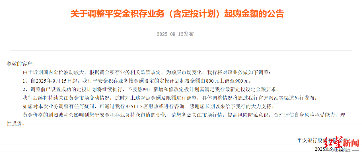 9月12日,平安银行宣布,从9月15日起,将平安积存金按金额设定的定投计划起投金额由800元上调至900元。