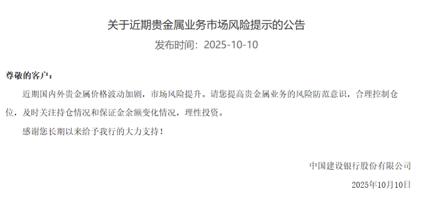 建设银行则分别于9月24日、10月10日对贵金属业务市场风险作出提示公告。建行表示,近期国内外贵金属价格波动加剧,市场风险提升。请投资者提高风险防范意识,合理控制仓位,及时关注持仓情况和保证金余额变化情况,理性投资。