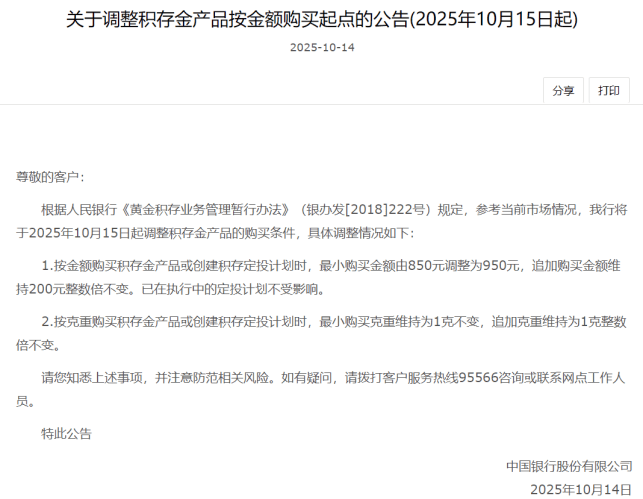 10月14日,中国银行宣布,10月15日起按金额购买积存金产品或创建积存定投计划时,最小购买金额由850元调整为950元。