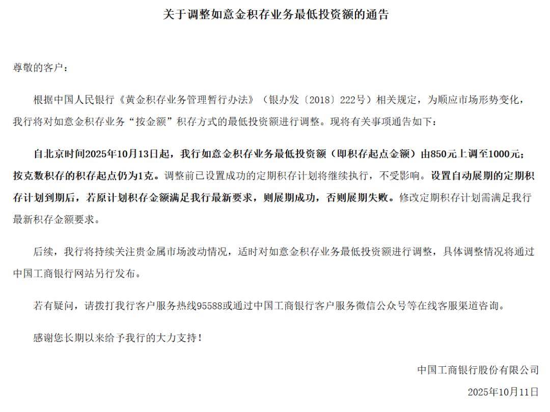 10月11日,工商银行也发布了相关公告,提高了该行积存金业务的投资门槛。公告显示,自10月13日起,该行将如意金积存业务最低投资额(即积存起点金额)由850元上调至1000元;按克数积存的积存起点仍为1克。