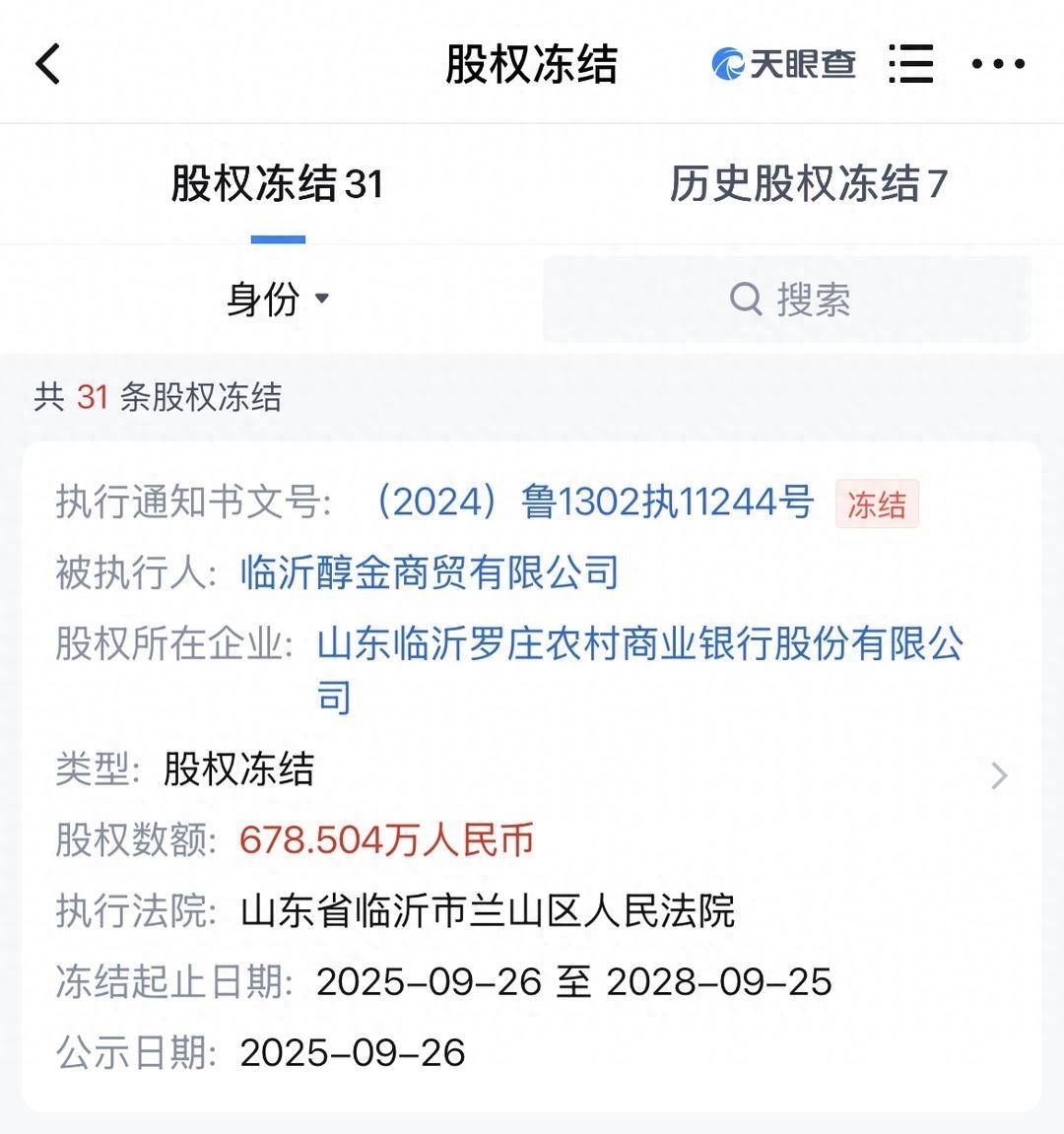 近日,山东临沂罗庄农村商业银行股份有限公司(以下简称“罗庄农商银行”)新增一则股权冻结信息,临沂醇金商贸有限公司(以下简称“醇金商贸”)持有的该行678.5万股股权被临沂市兰山区人民法院冻结。