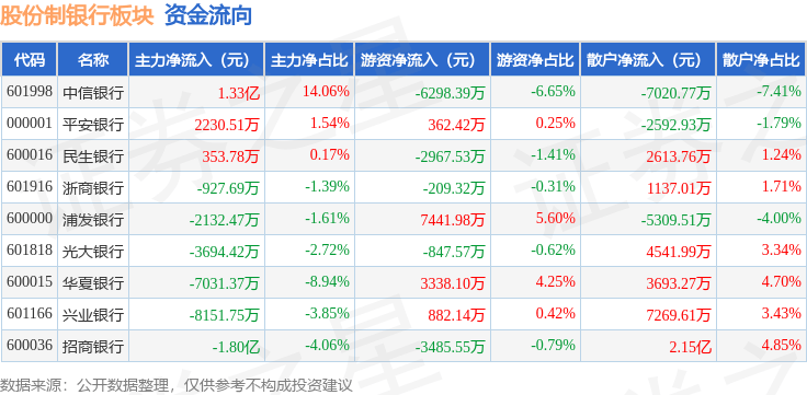 从资金流向上来看,当日股份制银行板块主力资金净流出2.4亿元,游资资金净流出1783.73万元,散户资金净流入2.58亿元。股份制银行板块个股资金流向见下表: