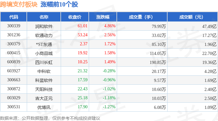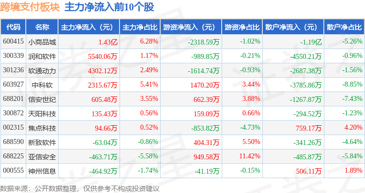 从资金流向上来看,当日跨境支付板块主力资金净流出12.11亿元,游资资金净流入4.13亿元,散户资金净流入7.98亿元。跨境支付板块个股资金流向见下表: